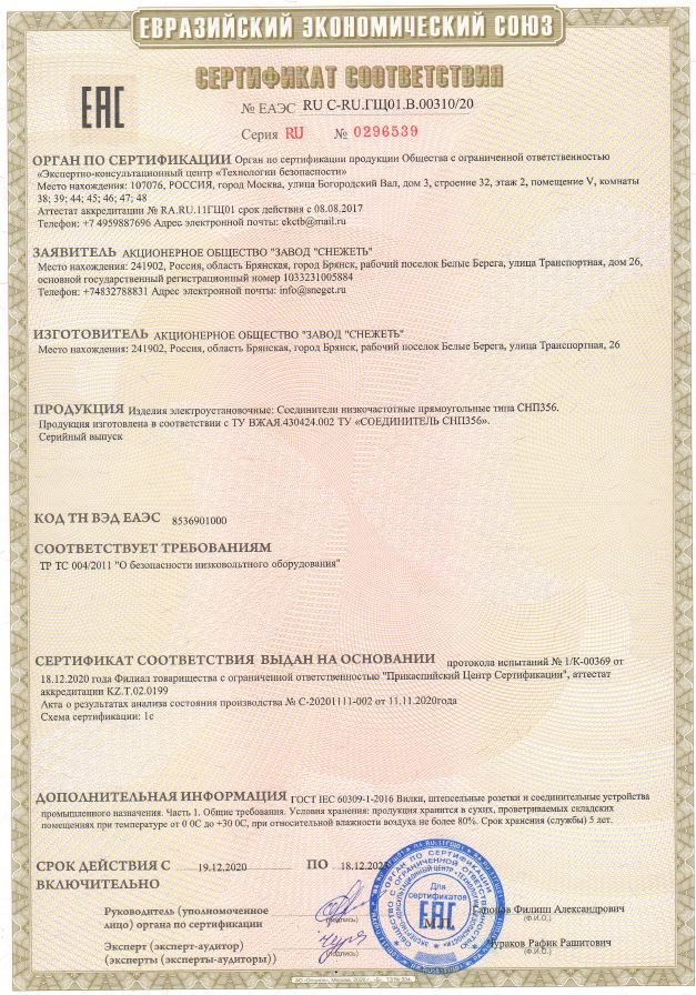 Наличие сертификата соответствия требованиям ТС/ТР 004-2011 подтверждает соответствие электрических соединителей серии СНП356 всем требованиям безопасности, указанным в техническом регламенте "О безопасности низковольтного оборудования".
